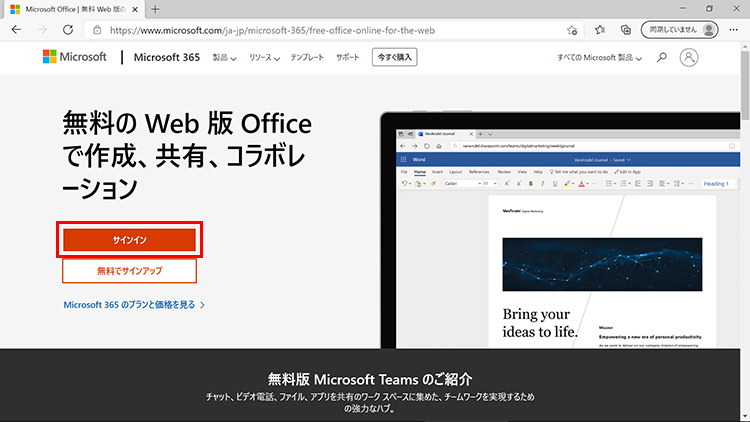 Web版Officeの紹介サイトにアクセスしたら、「サインイン」をクリックします。下にスクロールして「Office.comに移動する」をクリックする方法もあります。
