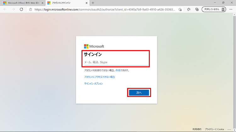 サインインの画面が表示されたら、お使いのMicrosoftアカウントの情報を入力して「次へ」をクリックします。