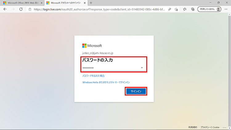 パスワードを求められたら入力し、「サインイン」をクリックしてサインインします。
