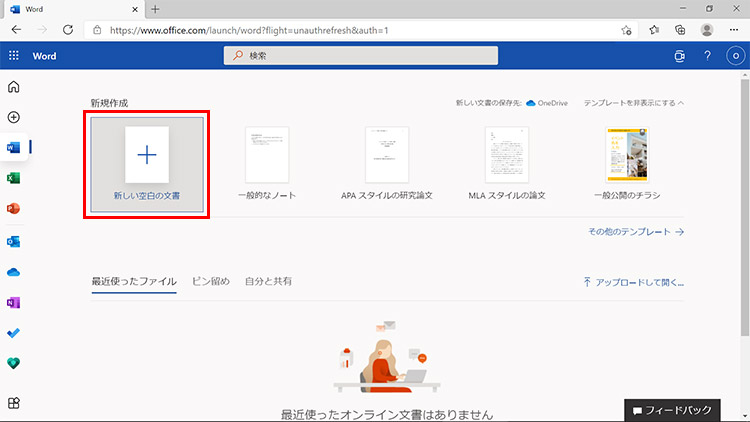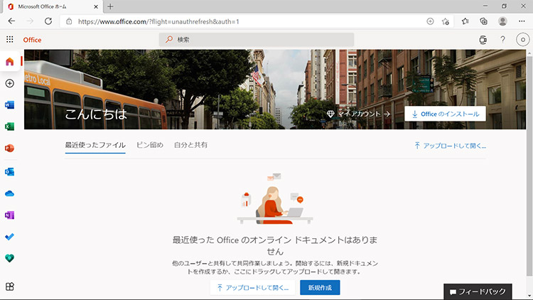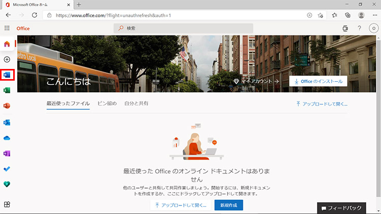 サインインが済んだら、Web版Officeのホームページが表示されます。左に表示されているWordやExcel、PowerPointのアイコンをクリックすると利用できます。ここでは、文書を新規に作成して保存する方法とパソコンに保存されているファイルを開く方法を紹介します。