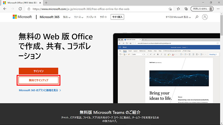 アカウントを作成するには、Web版Officeのサイトで「無料でサインアップ」をクリックします。