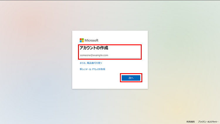 メールアドレス(または電話番号)を入力し、画面に従って作成を進めます。ここで新しくメールアドレスを取得することも可能です。