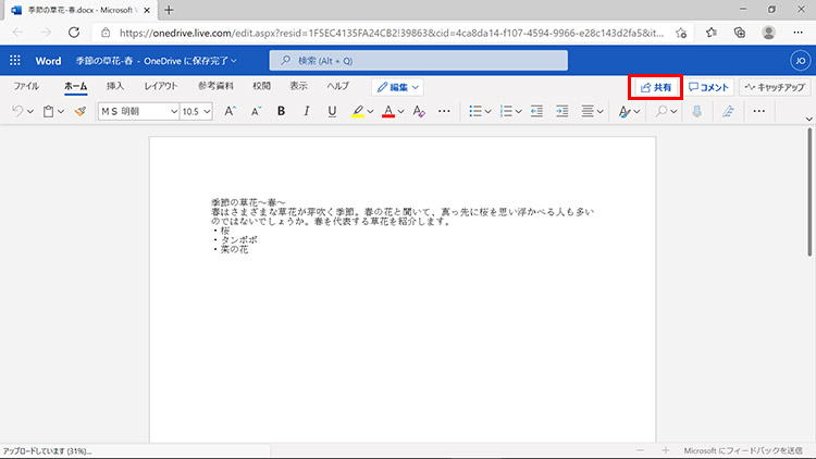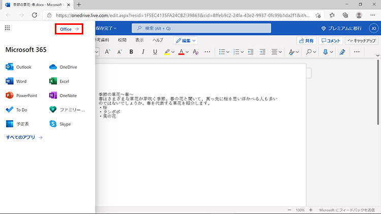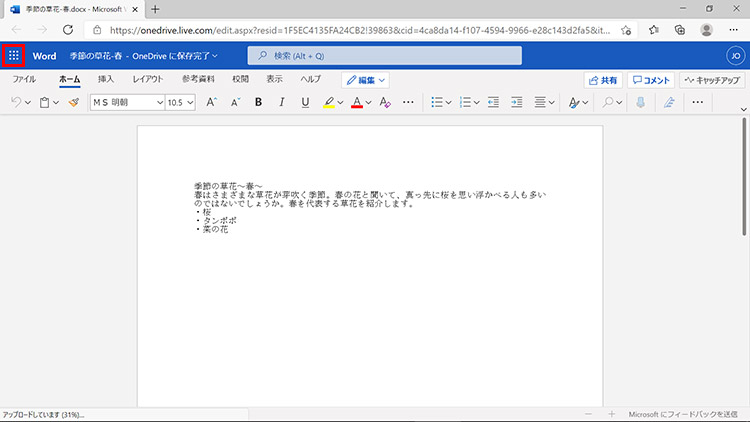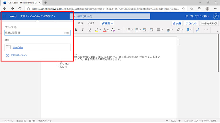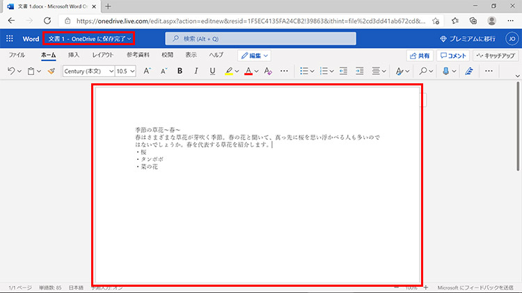 新規文書の作成画面が表示されるので、文書を作成します。作成途中も、文書はインターネット上の「OneDrive」に自動保存されます。文書を作成したら、画面上の「文書1 - OneDriveに保存完了」の表示をクリックします。