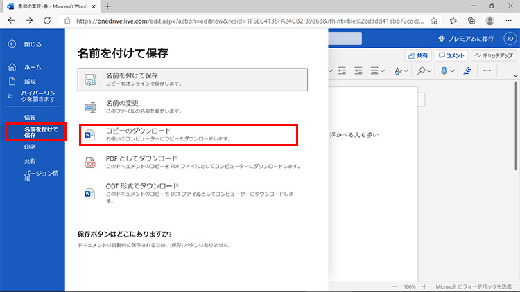 パソコンなどの端末に保存したい場合は、「ファイル」メニューから「名前を付けて保存」を選択し、「コピーのダウンロード」を選択します。