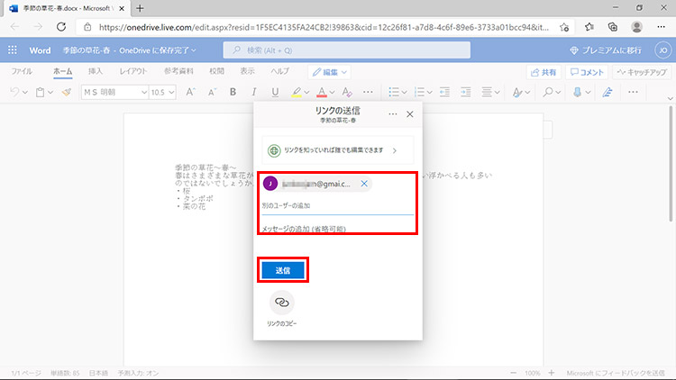 共有したい人の名前またはメールアドレスを入力し、「送信」をクリックします。「リンクのコピー」からリンクをコピーして、メールに貼り付けて送ることもできます。