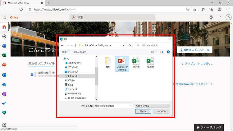 ファイルを選択し、「開く」をクリックすると、選択したファイルがOneDriveにアップロードされ、ファイルを開くことができます。編集を行うと自動的に保存されます。他のパソコンから同じアカウントでサインインすることで、続きの編集作業が可能です。