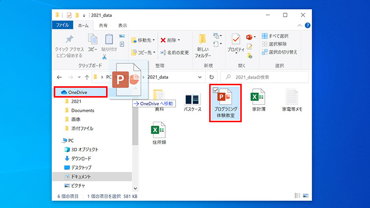 エクスプローラーを開いて「OneDrive」フォルダーを開き、バックアップしたい既存のファイルやフォルダーをドラッグして移動します。「同期」機能により、自動的にOneDriveに保存されます。