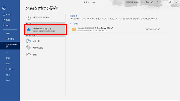 新規文書の場合、ファイルを保存する操作で保存先にOneDriveを選択します。保存したファイルは、エクスプローラーの「OneDrive」フォルダーに表示されます。