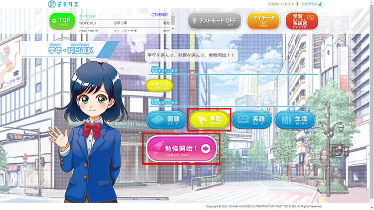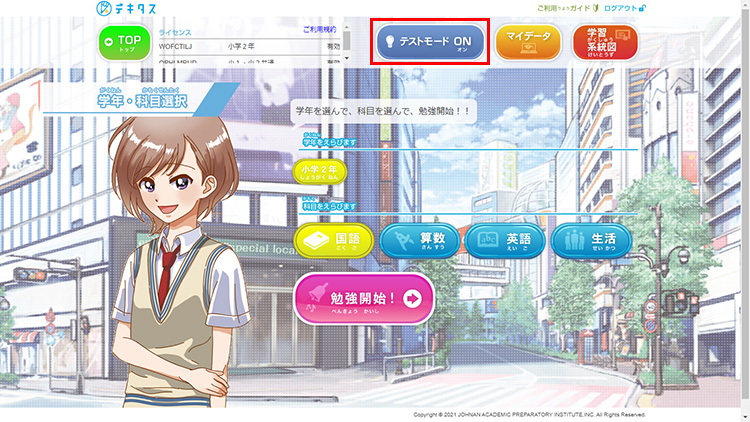 科目選択画面で「テストモード ON」にし、科目を選択、「勉強開始」をクリックします。
