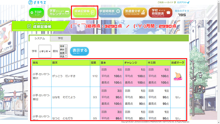 「マイデータ」では、さまざまな学習状況を確認できます。「成長記録帳」では、今までに学習した回数、点数などについて、細かく見ることができます。