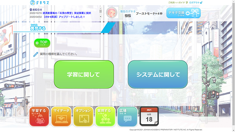「質問する」画面。「学習に関して」と「システムに関して」から選んで質問することができます。