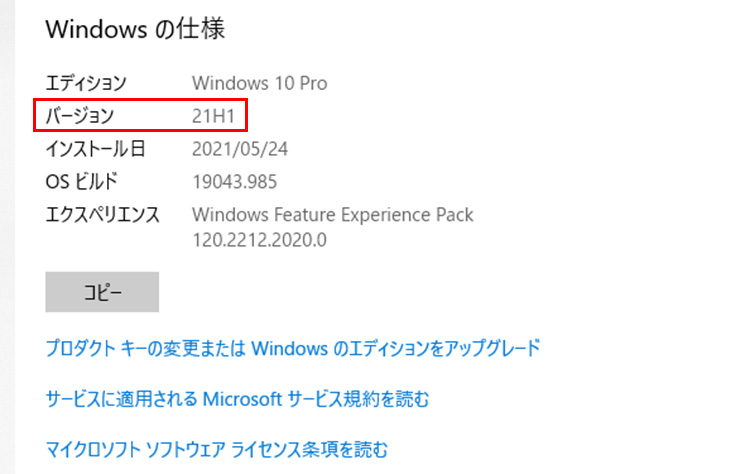 「Windowsの仕様」の「バージョン」が「21H1」になっていれば、アップデートが完了しています。