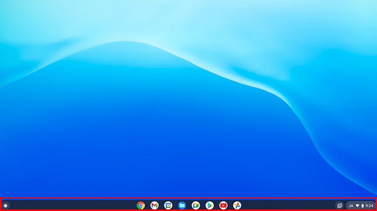 Chromebookのデスクトップ画面。下部に「シェルフ」(Windowsのタスクバーと同様のもの)が表示されている、シンプルな画面です。