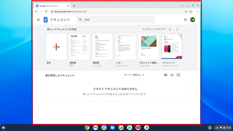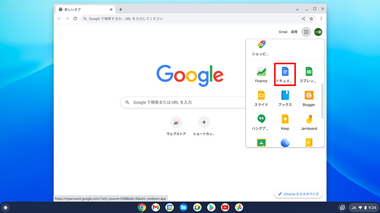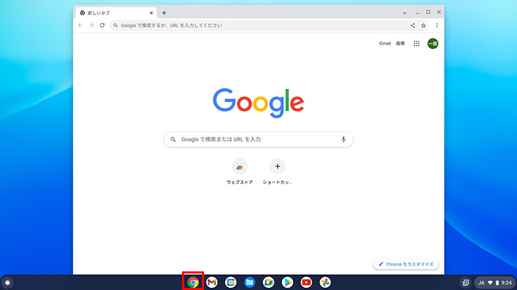 シェルフの「Chrome」アイコンをクリックすると、Chromeブラウザが開きます。