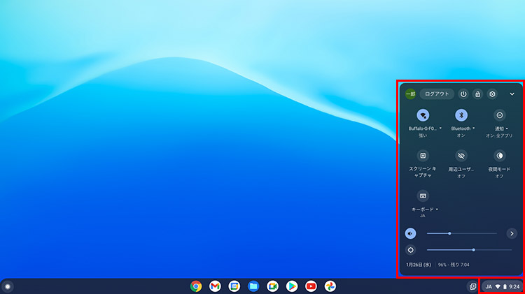右下の時計の部分をクリックすると、ネットワークの状態や音量などを確認・設定できるメニューが開きます。