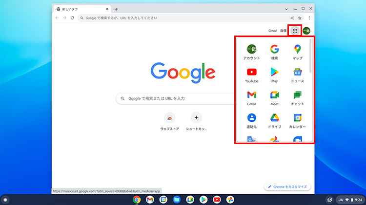 Chromeブラウザの画面右上にある「Googleアプリ」をクリックすると、利用できるアプリの一覧が表示されます。