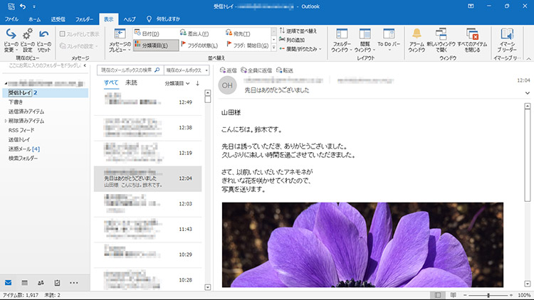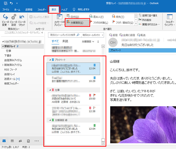 「表示」タブの「分類項目」をクリックすると、色ごとにメールがまとめて表示されます。
