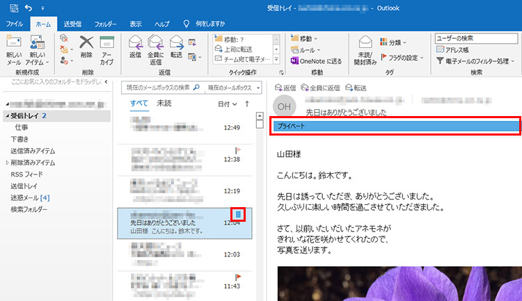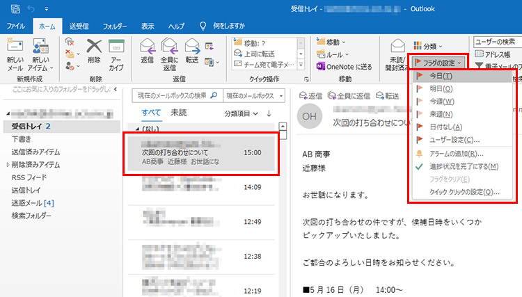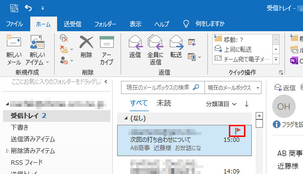 メールにフラグ(旗)を付けることができます。フラグを付けたメールをまとめて表示することもできるので、重要なメールに付けておくと良いでしょう。フラグには期日を設定することもできます。