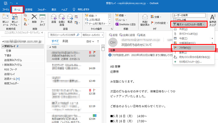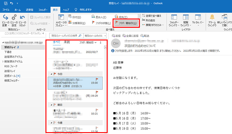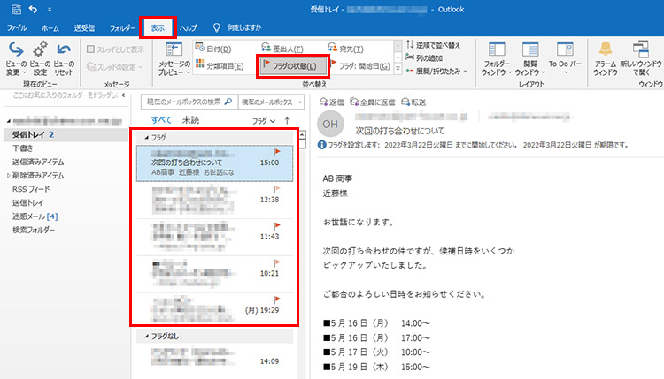 「表示」タブの「フラグの状態」をクリックすると、フラグが設定されたメールがまとめて表示されます。