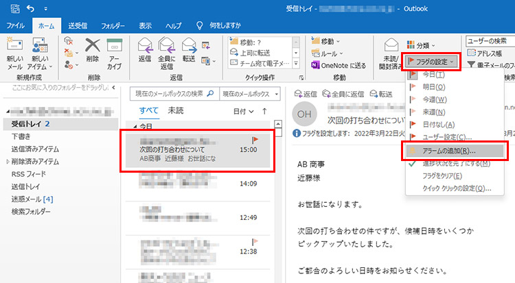 アラームを追加したいメールを選択し、「ホーム」タブの「フラグの設定」-「アラームの追加」を選択します。