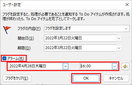 「アラーム」のチェックがオンになっていることを確認して日時を設定し、「OK」をクリックすればアラームが設定されます。