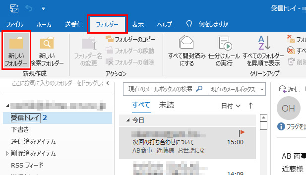 受信フォルダーに、自分で新しくフォルダーを作成することもできます。仕事の内容や、相手先によってフォルダーを作成し、メールを振り分けておけば、目的のメールを探しやすくなります。