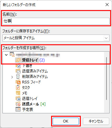 「新しいフォルダーの作成」画面で、「名前」にフォルダー名を入力し、「フォルダーを作成する場所」を指定して「OK」をクリックします。