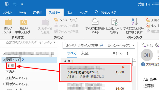 フォルダーが作成されます。一覧からメールを目的のフォルダーにドラッグ&ドロップすることで移動することができます。
