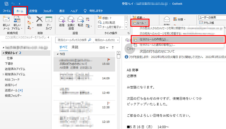 受信したメールを自動的に仕分けしたい場合は、「ホーム」タブの「ルール」-「仕分けルールの作成」を選択します。