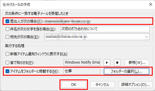 「仕分けルールの作成」画面の「次の条件に一致する電子メールを受信したとき」で仕分けの条件を設定します。「実行する処理」の「アイテムをフォルダーに移動する」のチェックボックスをオンにし、移動するフォルダーを指定して「OK」をクリックします。