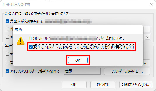 仕分けルールが作成されるので、「OK」をクリックします。「現在のフォルダーにあるメッセージにこの仕分けルールを今すぐ実行する」のチェックボックスをオンにして「OK」をクリックすると、ルールが作成されると同時に、これまでに受信したメールが仕分けされます。