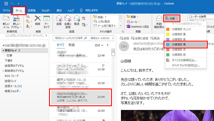 色を付けたいメールを選択し、「ホーム」タブの「分類」をクリックして色を選択します。