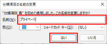 初めて色を選択した場合、色に名前を設定することができます。必要に応じて名前を設定し、「はい」をクリックします。なお、分類名については、「分類」-「すべての分類項目」で、修正したり、後から設定したりすることもできます。