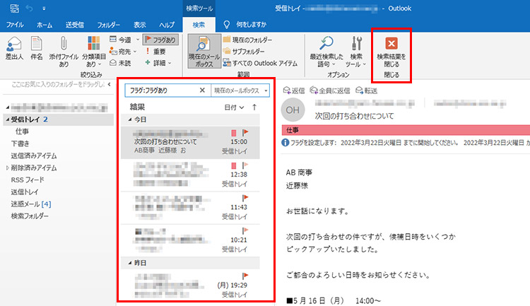 条件にあったメールだけが絞り込まれます。「検索結果を閉じる」をクリックすると元の一覧に戻ります。