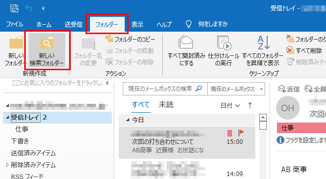 「フォルダー」タブで「新しい検索フォルダー」をクリックします。