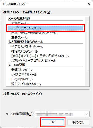 「新しい検索フォルダー」画面で、一覧から検索したい条件を選択し、「OK」をクリックします。