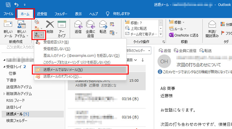 「迷惑メール」フォルダーに必要なメールが入っていました。メールを選択し、「ホーム」タブの「迷惑メール」-「迷惑メールではないメール」を選択します。