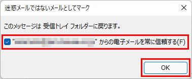 「~からの電子メールを常に信頼する」のチェックボックスがオンになっていることを確認し、「OK」をクリックします。これでメールアドレスがセーフリストに追加され、メールが受信フォルダーに移動します。