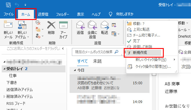 「ホーム」タブの「クイック操作」で一覧を表示し、「新規作成」を選択します。