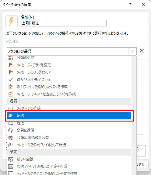 一覧からアクションを選択します。ここでは「転送」を選択しました。