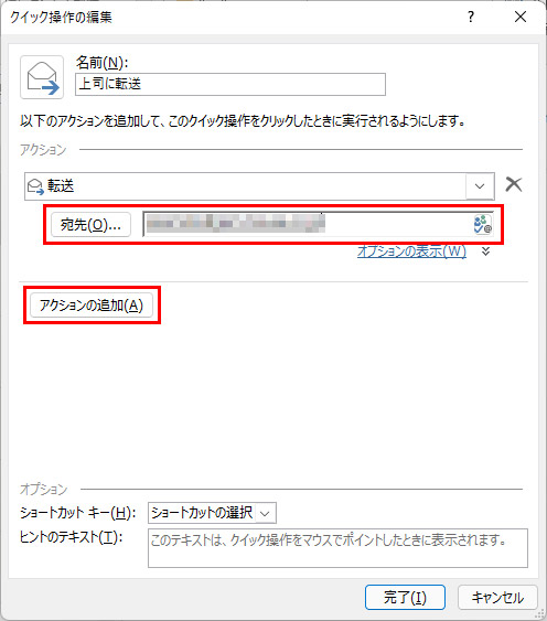 「宛先」に転送先のアドレスを設定します。「アクションの追加」をクリックします。