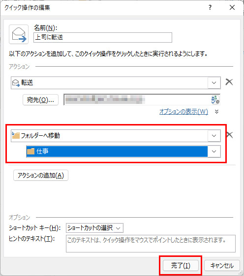 追加された「アクションの選択」をクリックし、アクションを選択します。ここでは「フォルダーへ移動」を選択し、移動先のフォルダーを指定しています。「完了」をクリックします。
