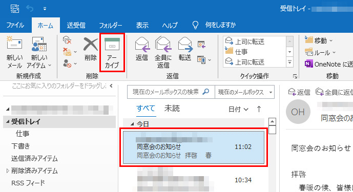 アーカイブに移動したいメールを選択し、「ホーム」タブの「アーカイブ」をクリックします。