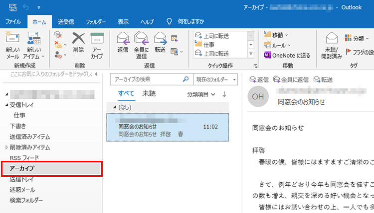 フォルダーに分類したメールも、用が済んだ古いものが増えてくると段々見づらくなってくると思います。そんな時に便利なのが「アーカイブ」です。古いメールを削除せずにアーカイブ(保管)しておくと、後で読み返すこともでき、普段使っているフォルダーも整理できます。