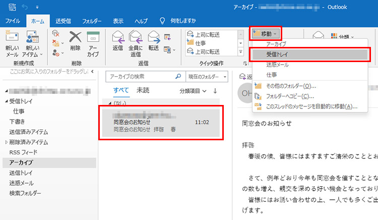 アーカイブフォルダーのメールを受信トレイに戻したいときは、メールを選択し、「ホーム」タブで「移動」-「受信トレイ」を選択します。