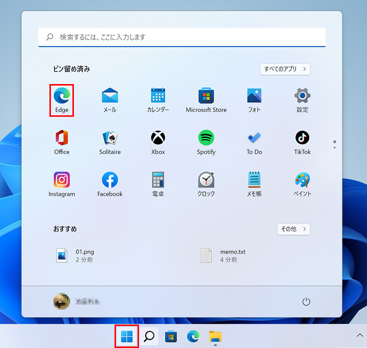 Windowsのスタートボタンをクリックし、「Edge」を起動します。
