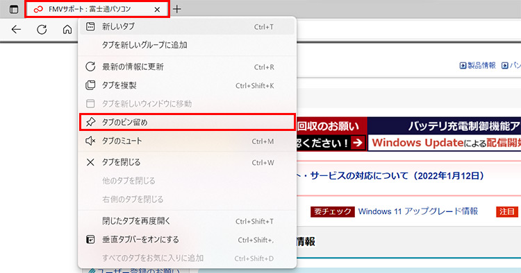 ピン留めしたいWebページのタブを右クリックして、「タブのピン留め」を選択します。