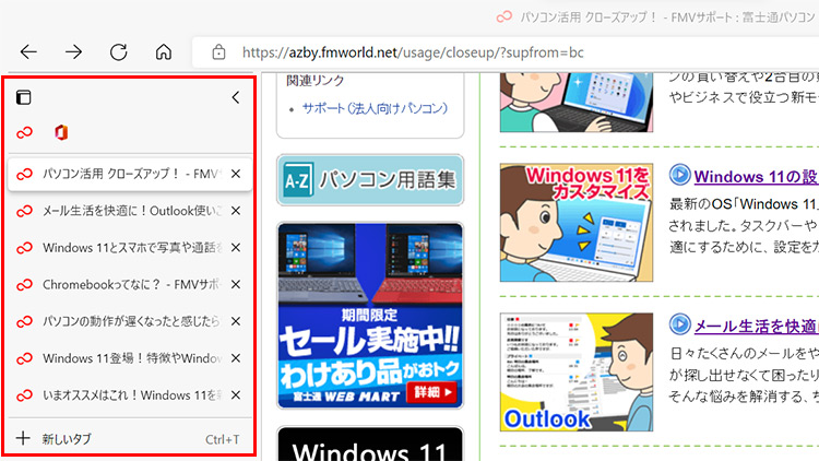 たくさんのタブを表示すると、どれが目的のWebページのタブか、見つけづらくなることがあります。そんなときは、タブを縦表示してみましょう。画面の左端にタブの名前が一覧表示されるので、すぐに見つけて切り替えることができます。特に画面が横長のパソコンの場合、有効活用できます。