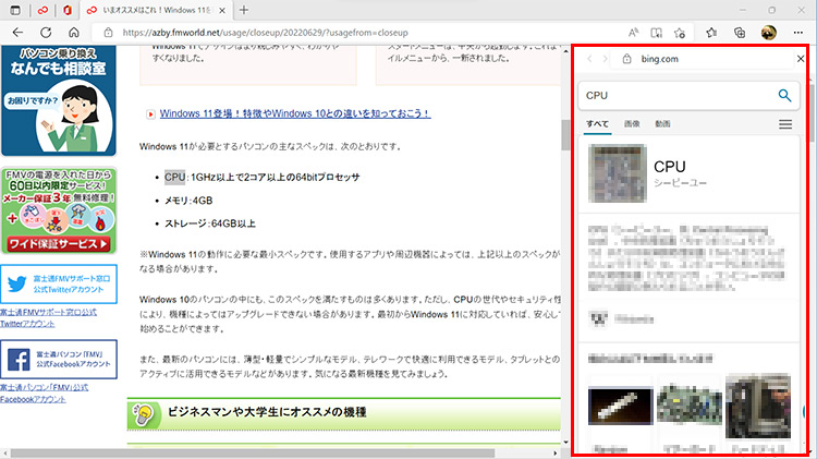 サイドバーが表示されて、検索結果が表示されます。知りたい情報をすぐに調べることができます。