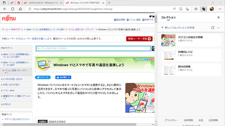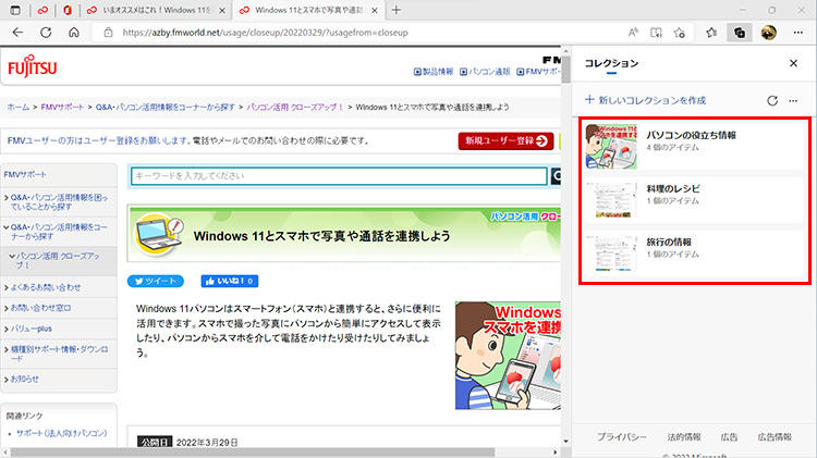 「パソコンの役立ち情報」「料理のレシピ」「旅行の情報」など、気になる情報を見つけたら、「コレクション」を使い、集めた情報を分類して保存しておきましょう。簡単に登録できて、画像のイメージも表示されます。後で見返したり、調べ直したりするときに、すぐに表示して確認することができます。